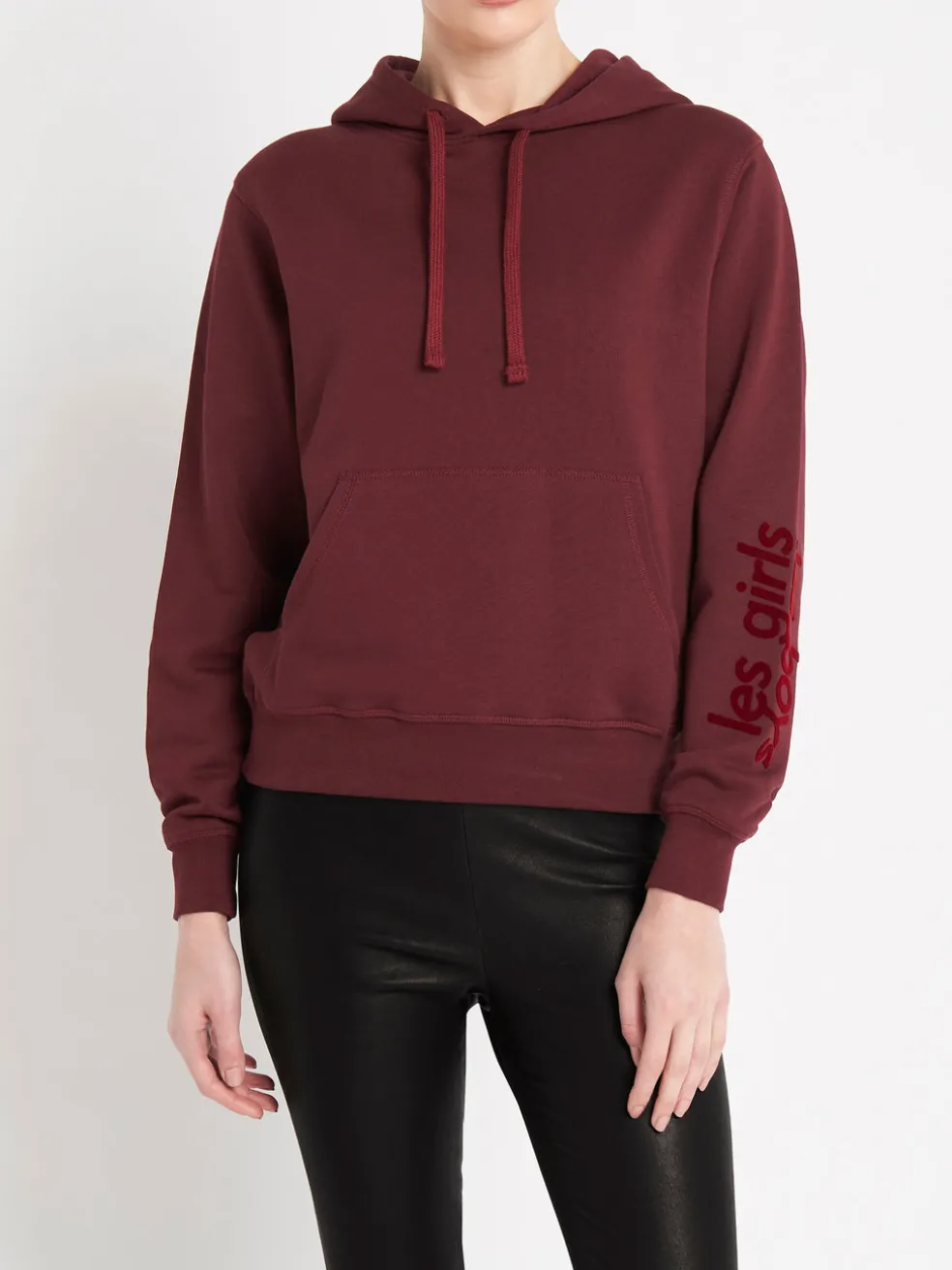 The Les Girls Les Boys slim shrunken hoodie in deep Tawny Port is cut from 100% organic cotton and in a lighter weight soft loopback for the warmer months. This wardrobe work-horse was made for sharing – or stealing – designed with clean, simple lines in mind it is finished with rib cuffed sleeves and hem, a printed logo on the sleeve and a drawstring double fabric hood for extra comfort and warmth. Pair it with the Les Girls Les Boys Straight Leg Track Pant in Tawny Port for the perfect lounge all day aesthetic.