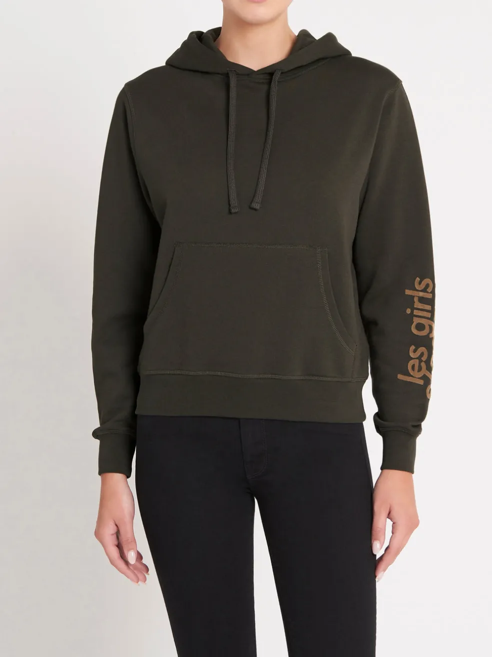 The Les Girls Les Boys Slim Shrunken Hoodie in Heady Moss is cut from 100% Organic Cotton and in a lighter weight soft loopback french terry. This wardrobe work-horse was made for sharing – or stealing – designed with clean, simple lines in mind it is finished with rib cuffed sleeves and hem, a flock printed logo in Shifting Sands on the sleeve and a drawstring double fabric hood for extra comfort and warmth. Pair it with the Les Girls Les Boys Straight Leg Track Pant in Heady Moss for the perfect lounge all day aesthetic.