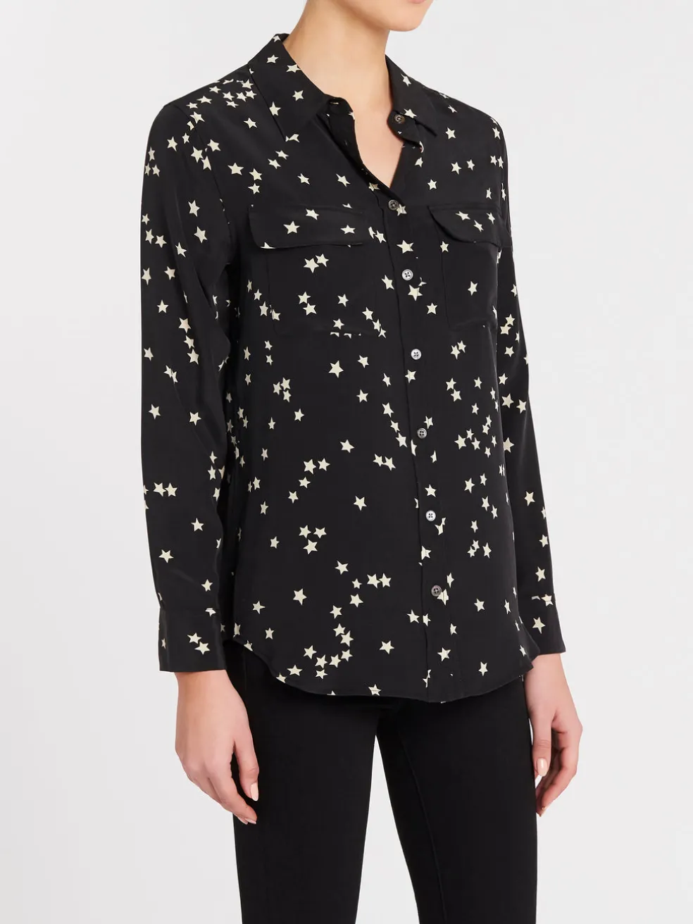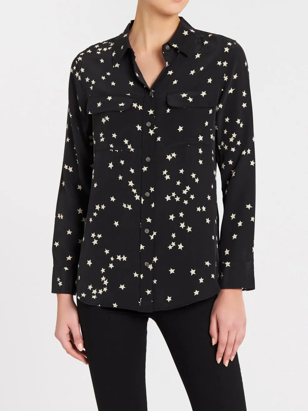 Refresh a wardrobe staple with the Slim Signature Shirt in True Black by Equipment. Inspired by their archived original, this slimmer fitting shirt is crafted from ultra soft silk, featuring dual front breast pockets, a clean fold back button placket, classic collar and centre back inverted box pleat and is finished with an updated white scattered star print and curved hemline making it perfect to layer. Wear this versatile shirt tucked into a pencil skirt or untucked with your favourite denim for a more relaxed look.
