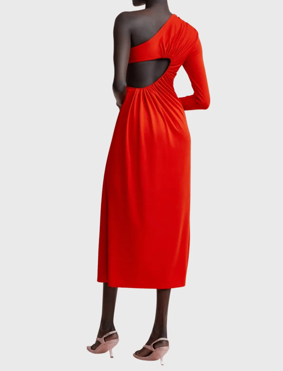 Crafted from a blend of stretch modal, this midi dress features a one-sleeve design, with an elasticated side bodice cut out and gathered fabrications that relax towards the hemline. The result is a timeless and elegant silhouette that exudes effortless luxury. The ultimate style piece for the modern woman