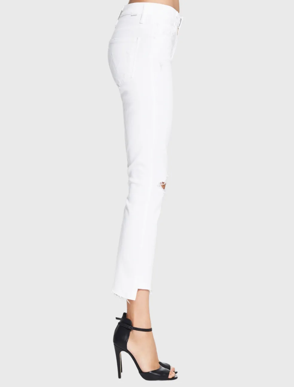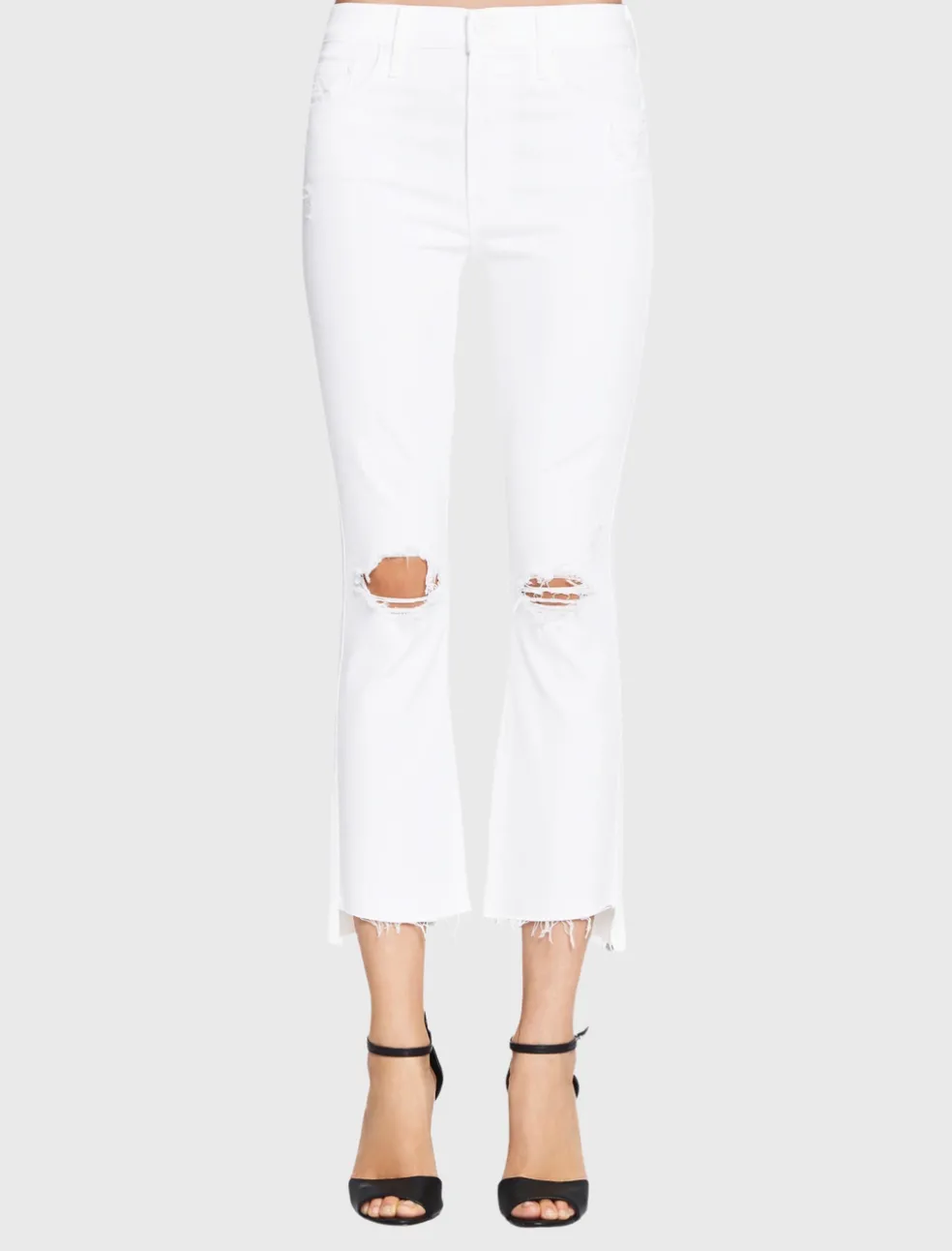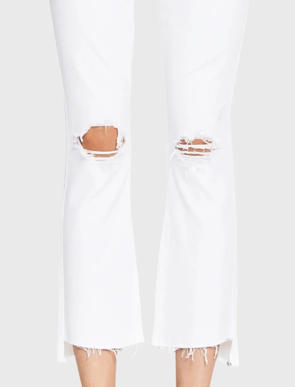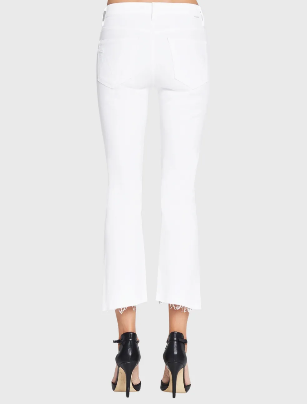 The perfect jean for spring is here. The Mother Denim Insider Crop Step Fray Jean in Cracked Slipper is a high rise crop style. Constructed from a white cotton blend denim these mid-high waist jeans feature a single button closure and zip fly with distressing at the knee and a raw frayed step hem. Finished with white hardware these jeans are perfect to team with either a pop of colour or a simple black shirt.