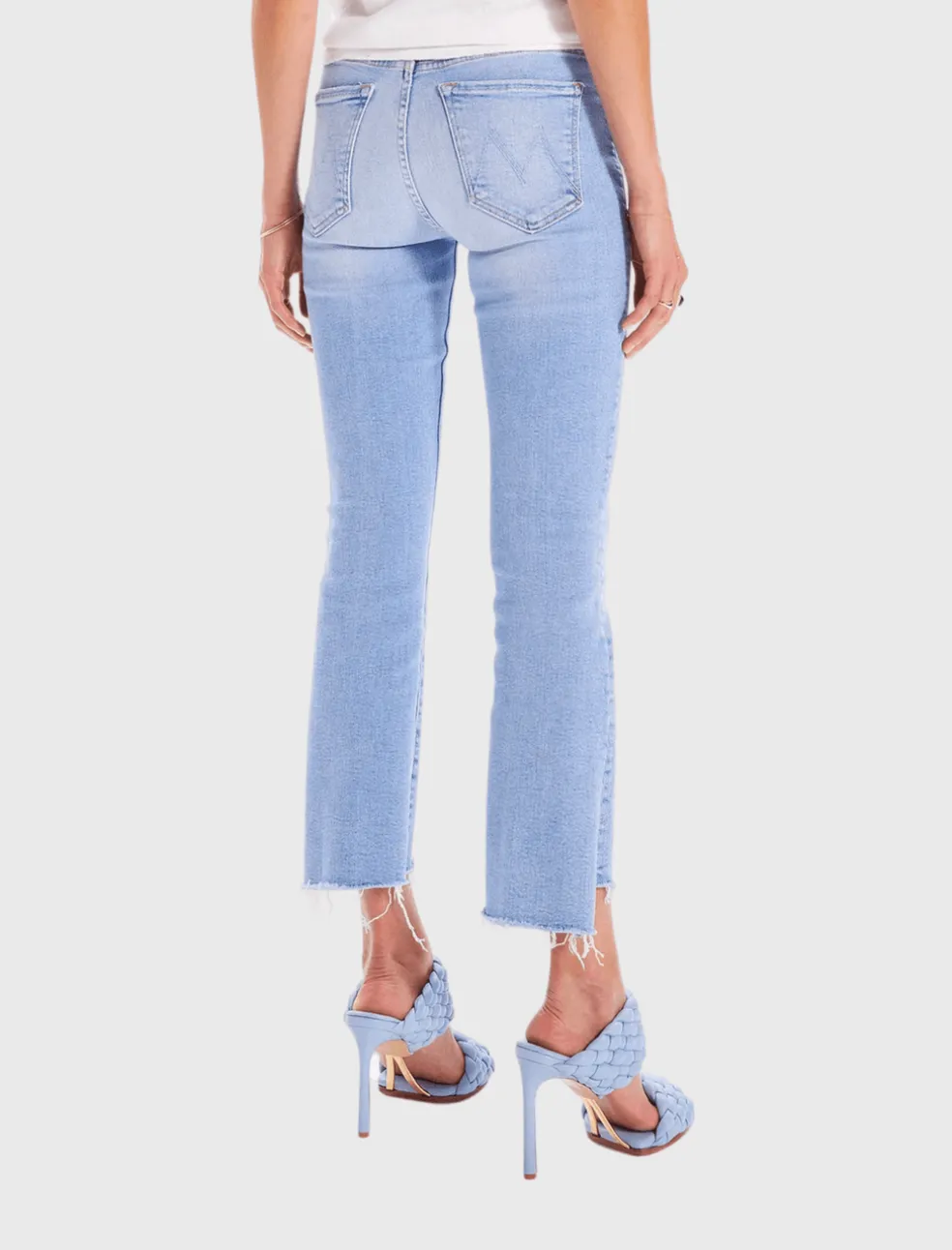 One of One, Number One, Only – UNIQUE. The Mother Denim Insider Crop Step Fray Jean in Limited Edition is a high-waisted bootcut with an ankle crop and a frayed step-hem. Cut from stretch denim, Limited Edition is a bright light blue wash with whiskering and fading throughout. Category? Bad Bitch.