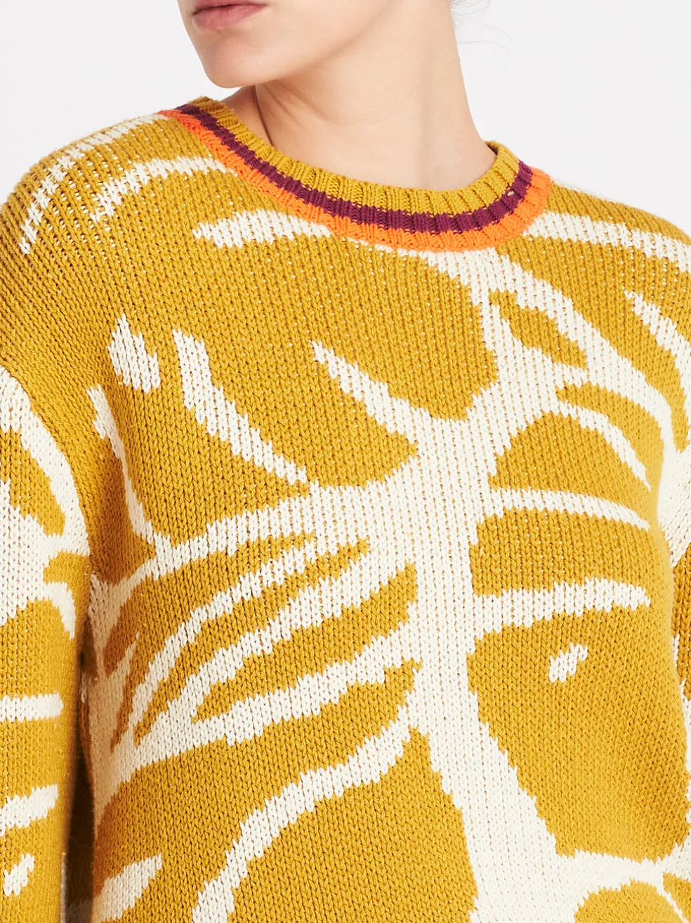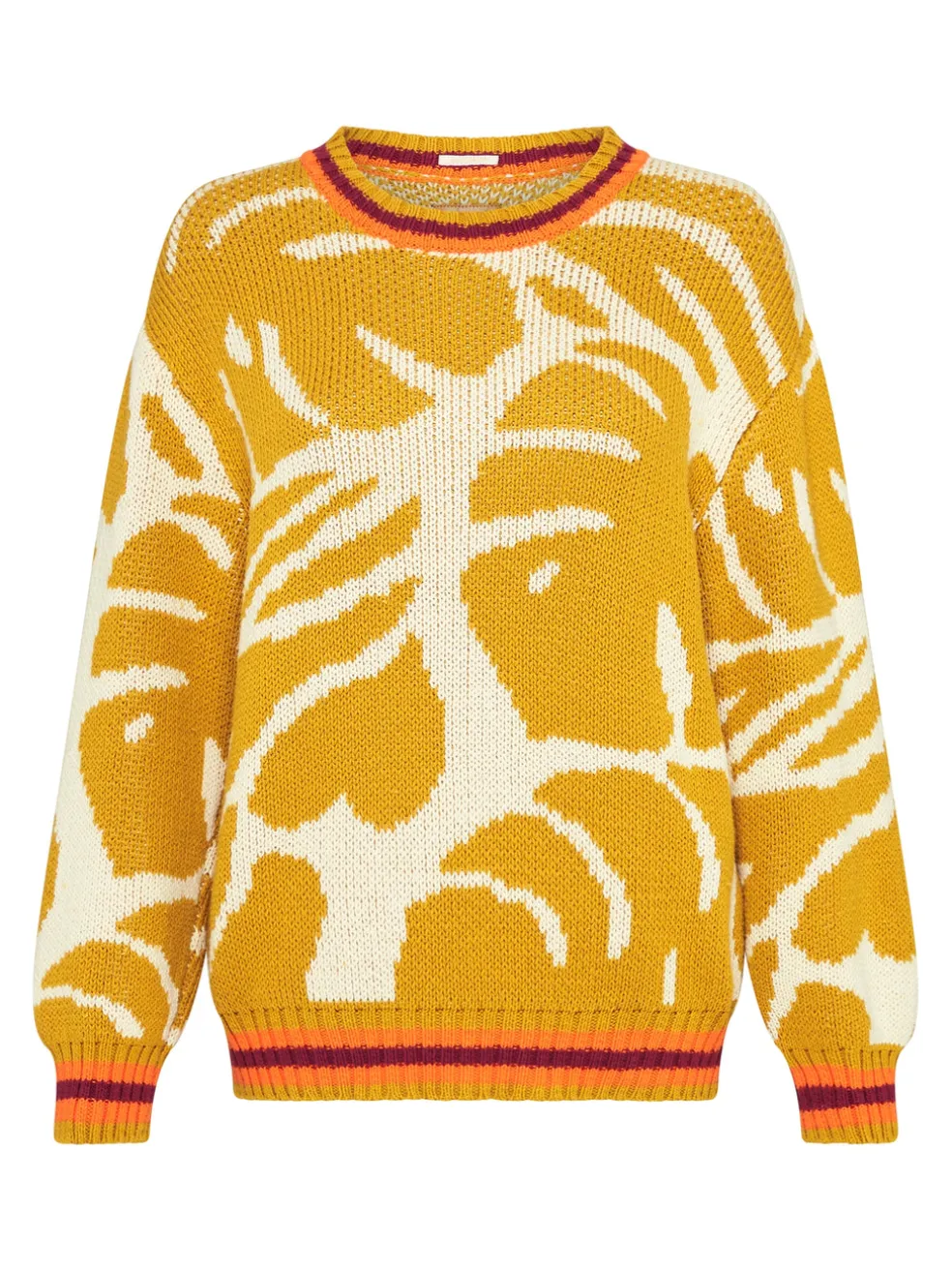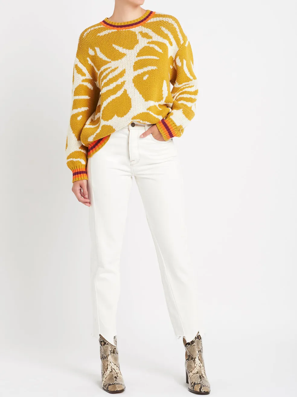 Are you ready for your new favourite jumper? Mother Denim presents The Jumper in Wild Palms, a pullover sweater with a crewneck and relaxed fit. Made of 100% cotton, the sweater features monstera leaves and varsity stripes. Soft to touch, versatile, and waiting for you.