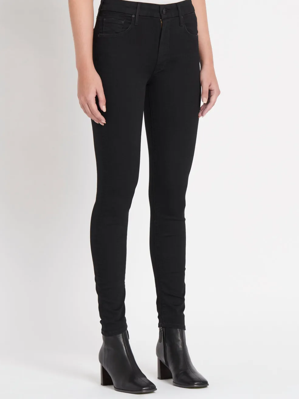 The Looker Jean by MOTHER are a skinny fitting style that is here Not Guilty a premium black denim. These super stretchy jeans have a mid rise of 8.5 inches and are detailed with matte black hardware.