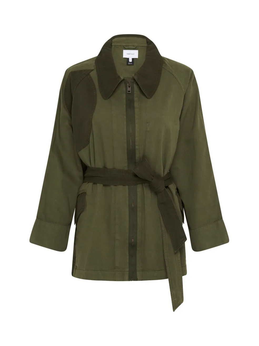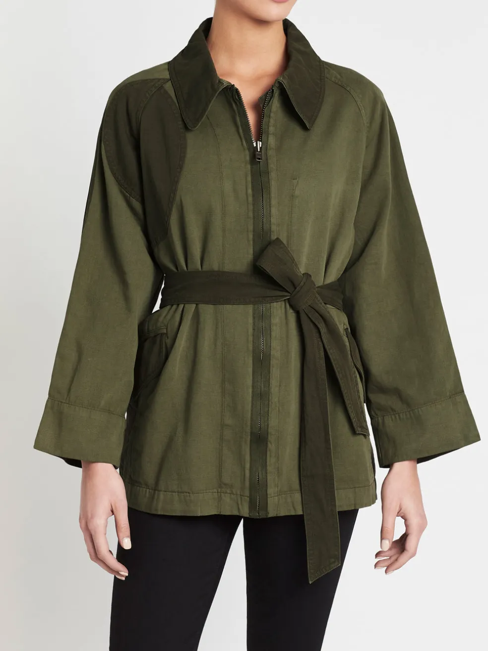 The Relaxed Military Jacket in Army Green by Current Elliott was inspired by vintage military wear. This feminine cool jacket is constructed in a durable cotton linen blend and features a flattering waist tie, kimono sleeves and duel waist side pockets. Finished with a patch paneling detailing and front metal hardware zip closure. Team yours with your favourite denim for an ultra cool re-work of a must have classic.