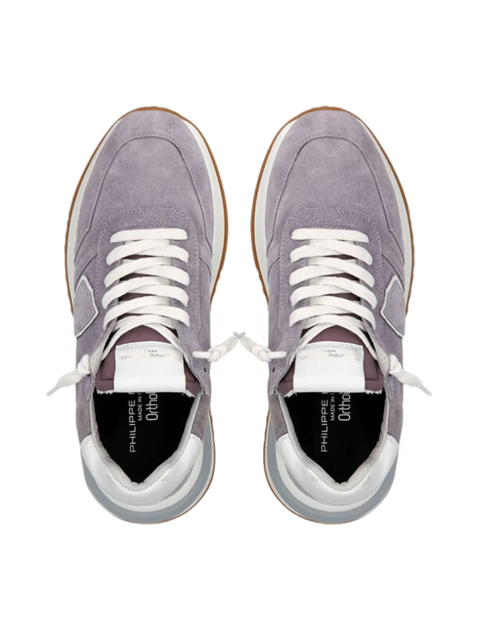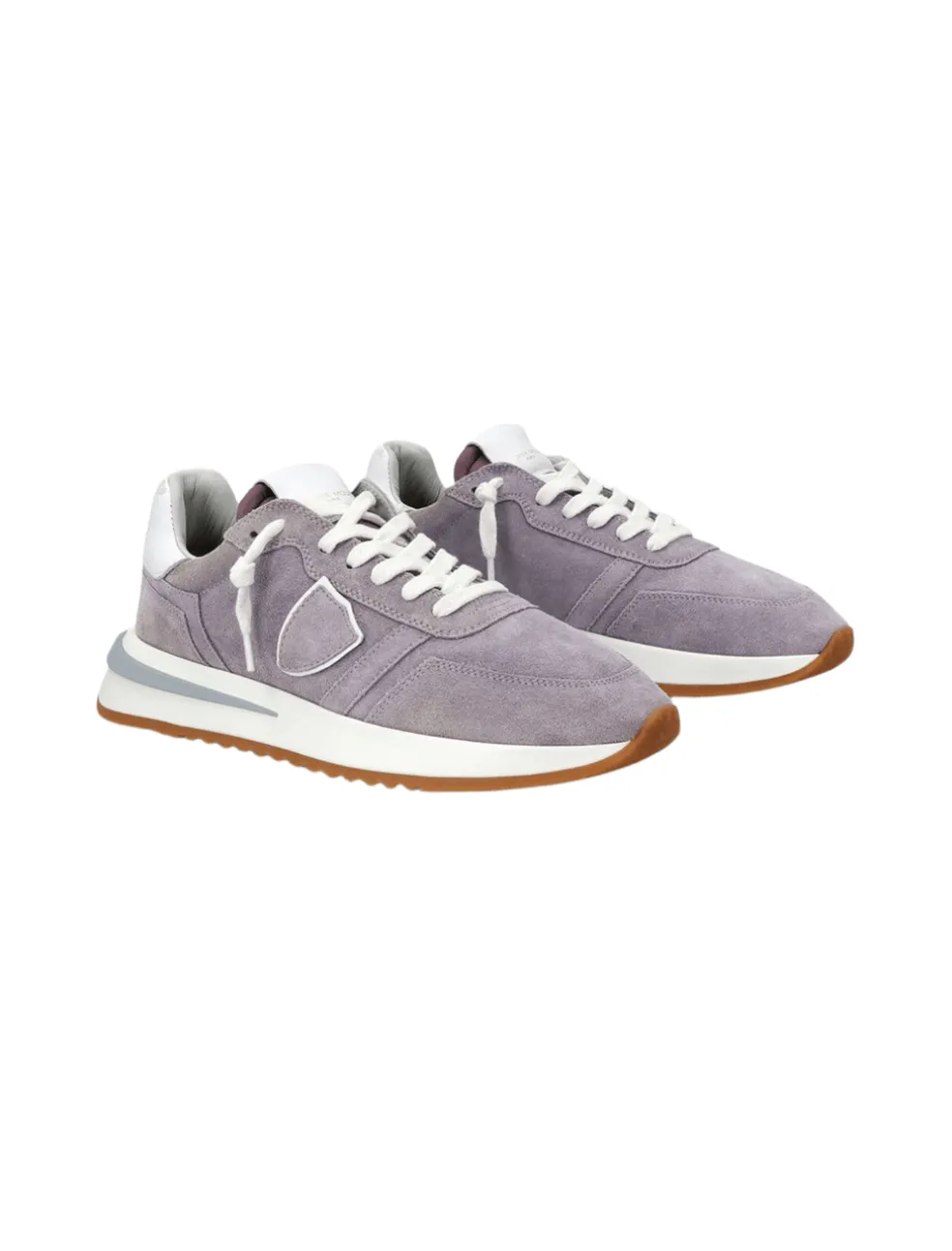 These hybrid casual-active style from Italian shoe maker Philippe Model is a must have style for your everyday wardrobe. Featuring a soft Lilac Suede upper with a worn effect white calfskin heel tab and a nylon tongue.