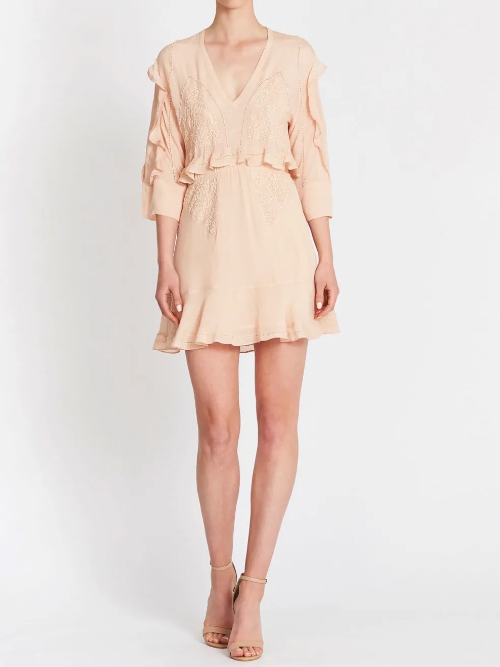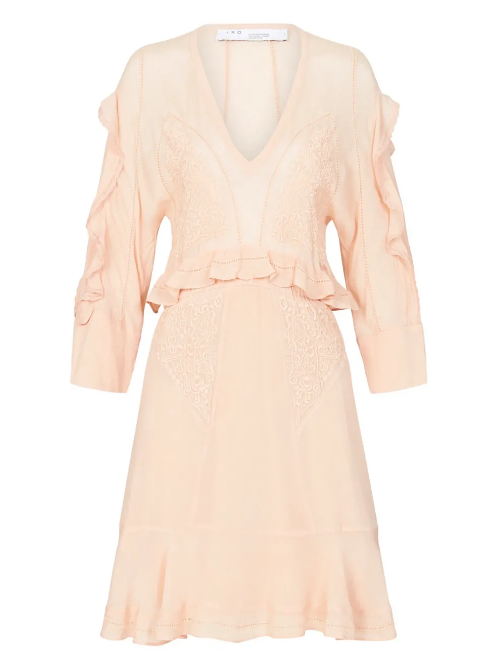 Indulge in ethereal beauty with IRO’s Underco Dress in Old Pink. This captivating design embodies pure femininity, drawing attention to its delicately ruffled construction that cascades gracefully down the body.