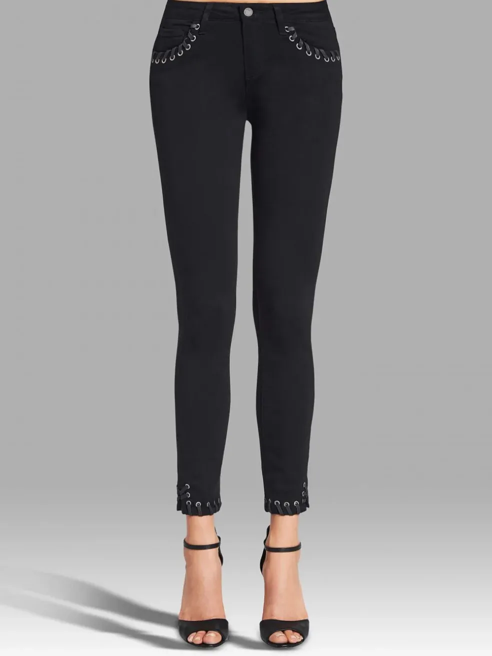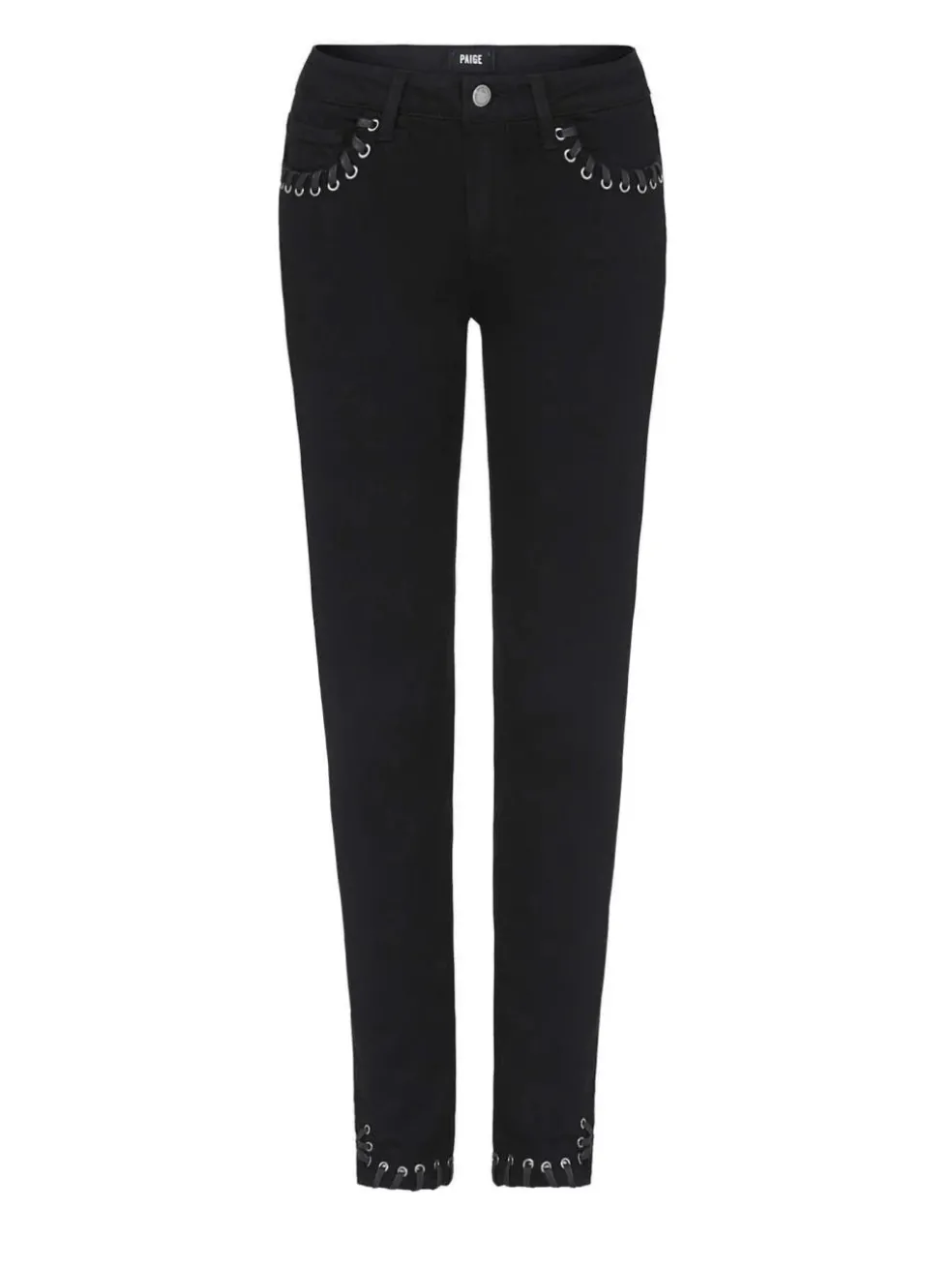 These Verdugo Ankle Jeans from Paige are a fashion style which showcase rock and roll lace detail and silver eyelet accents. These super soft black denim jeans have a rise of 8 inches, tarnished gunmetal hardware, side slit detail on the hems.
