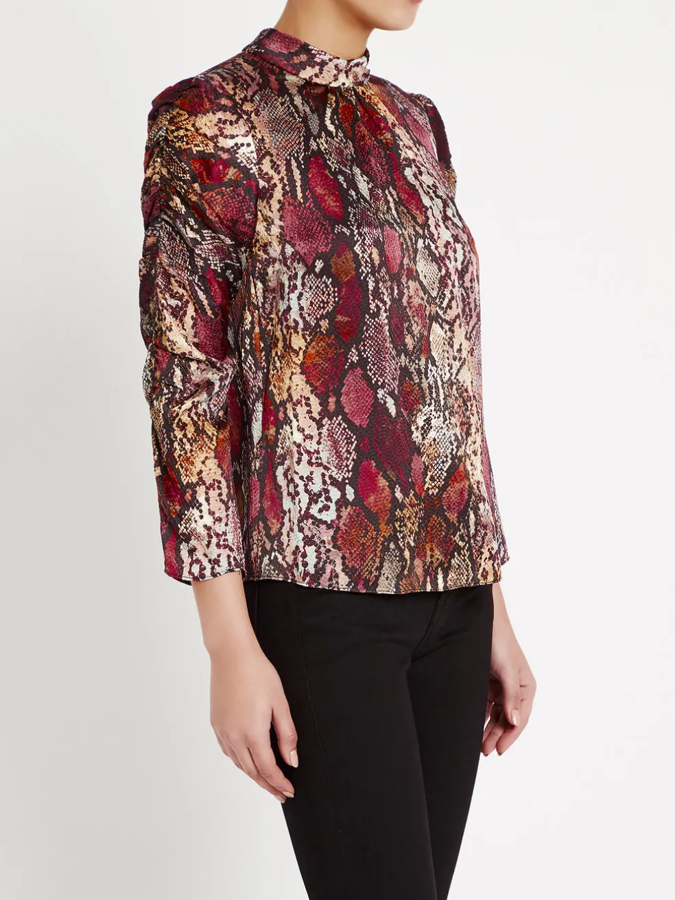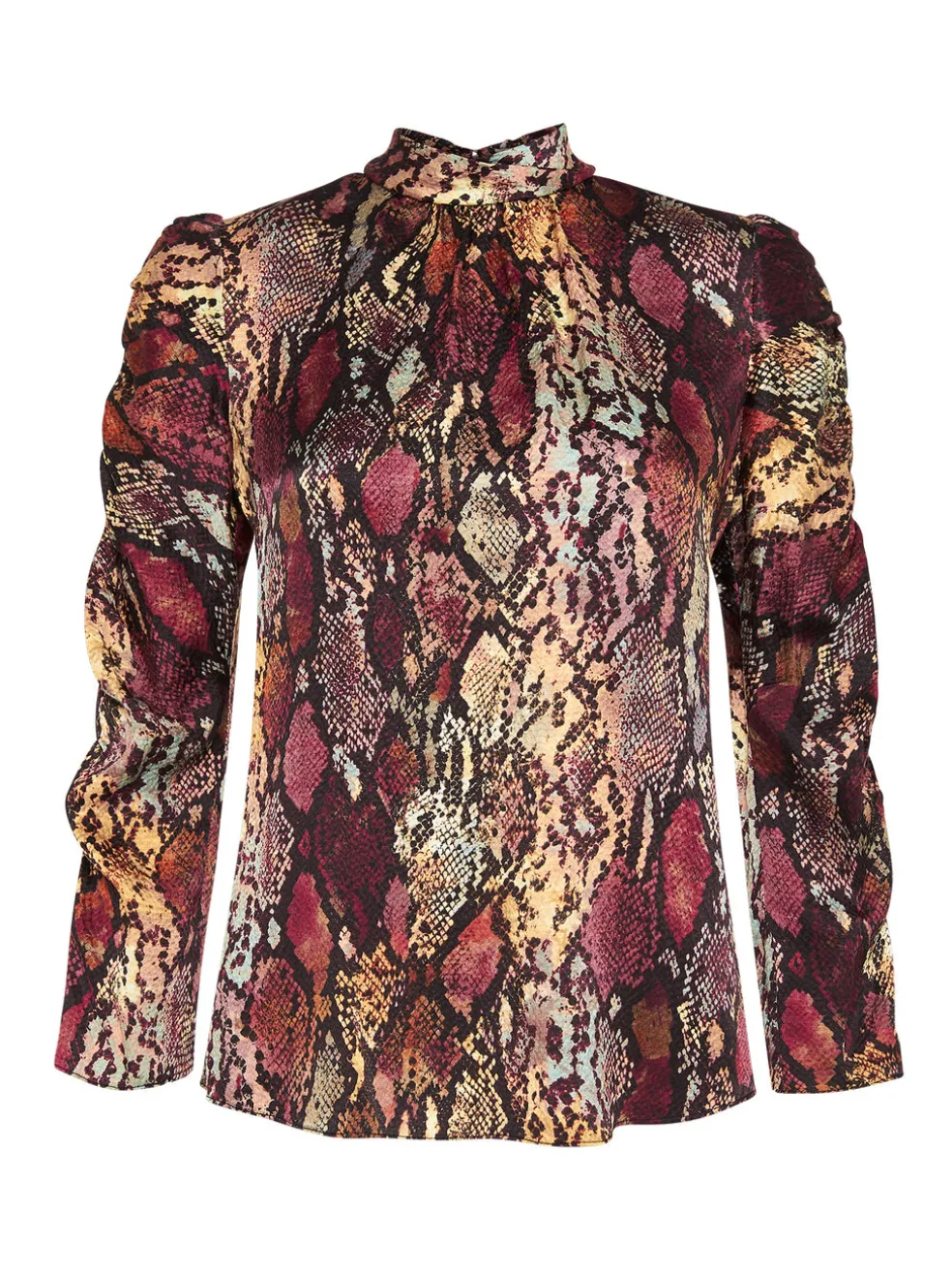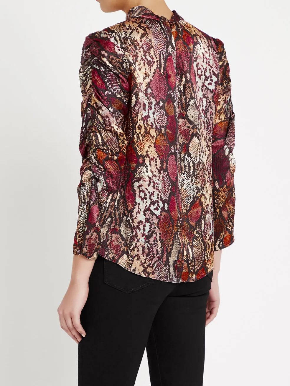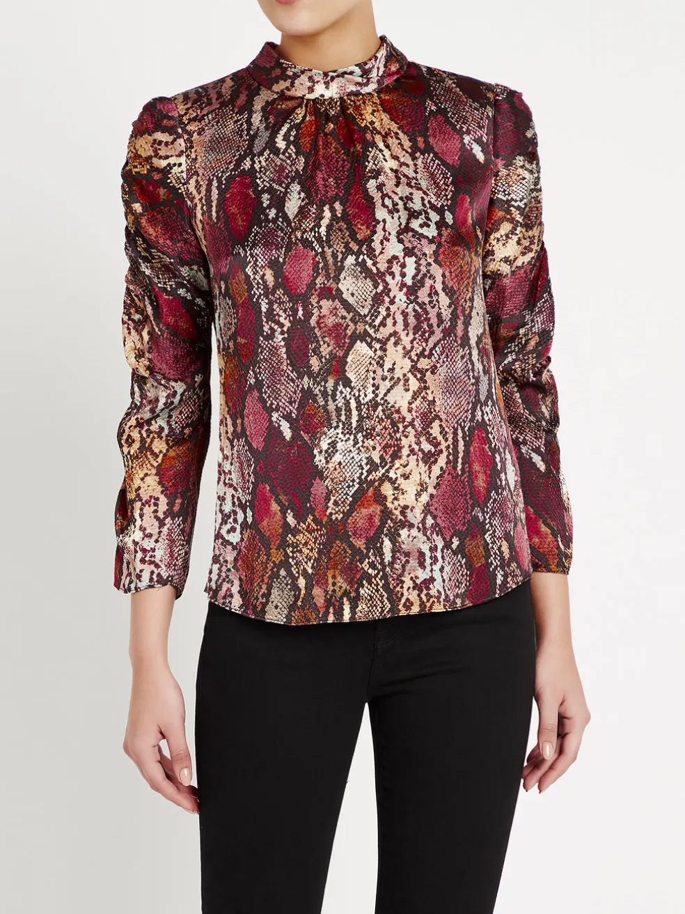 Inspire your day to night look with the Watercolor Snake Hammered Silk Top in Multi Combo by Rebecca Taylor this season. Constructed in ultra luxe hammered silk, this long sleeved top features a high neckline with a watercolour inspired palatte and pattern that elevates any look with puffed shoulders and ruched sleeves. Pair back with a leather mini skirt and boots for an effortless day to bar style.n