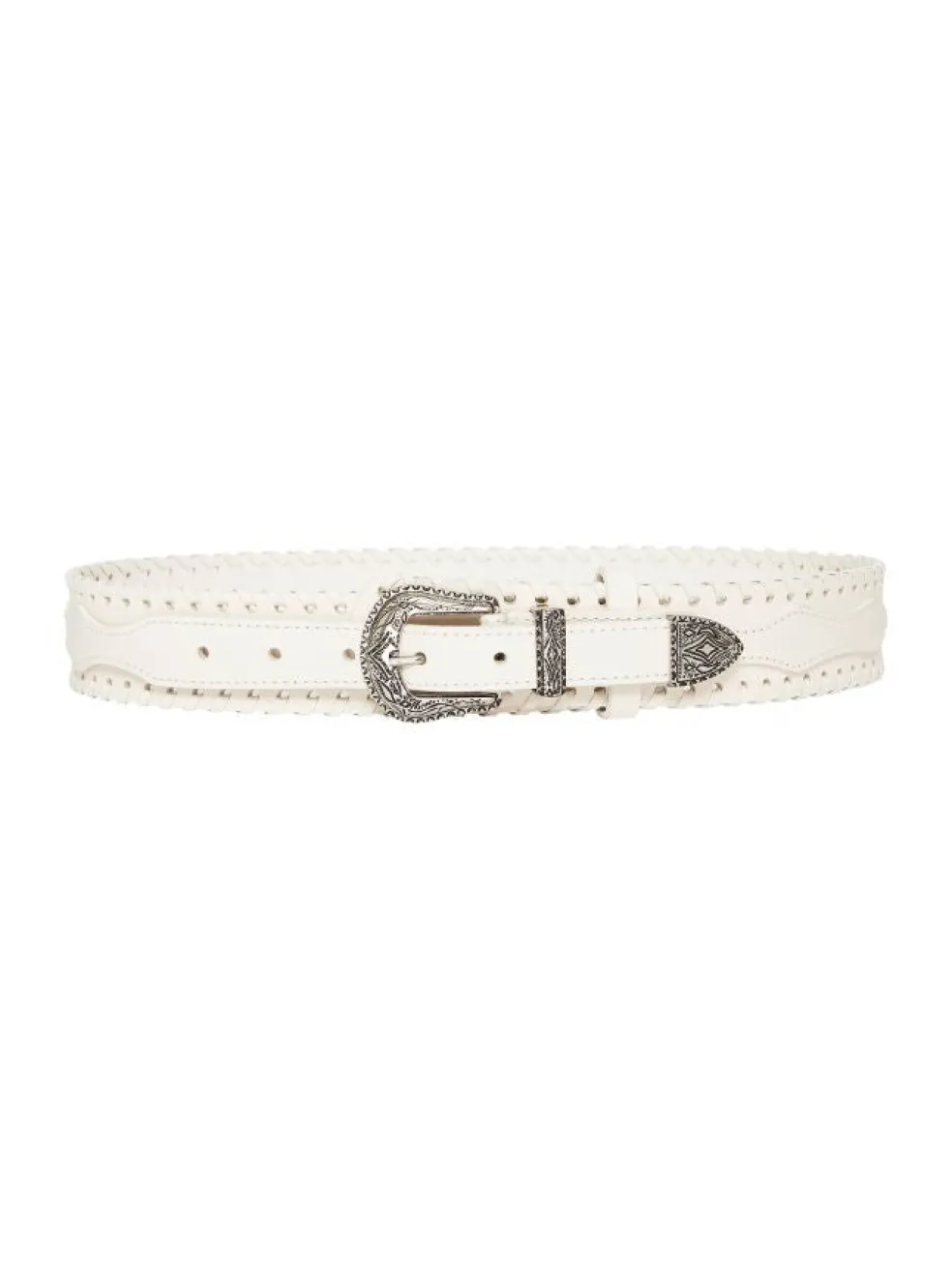 The IRO Westina Belt is a western inspired waist belt. Made from hard wearing genuine leather in a fresh white tone; the Westina belt features tarnished silver hard wear in a cowboy inspired design with leather blanket stitching along the edges..
