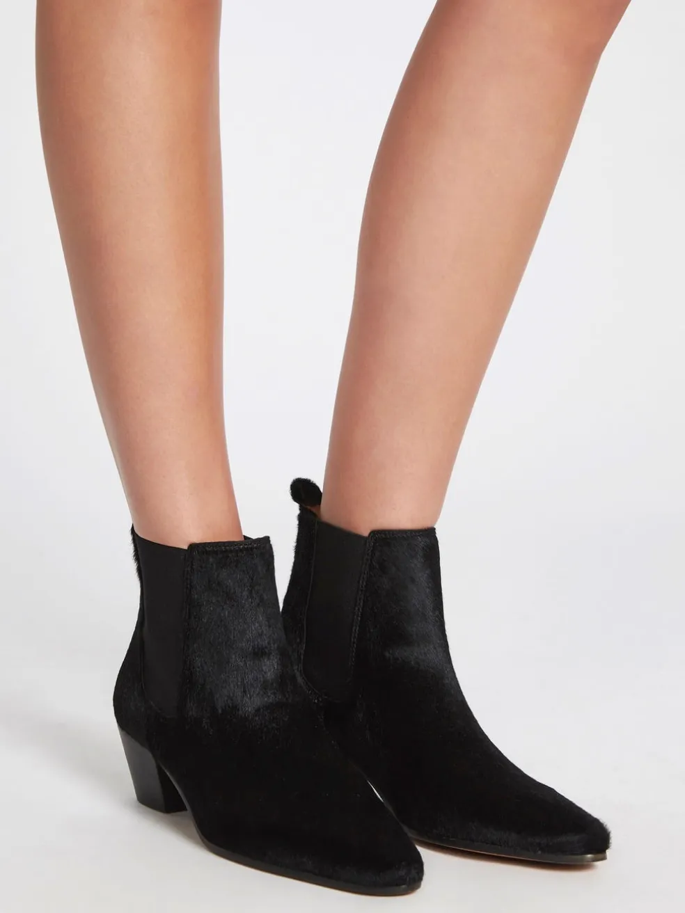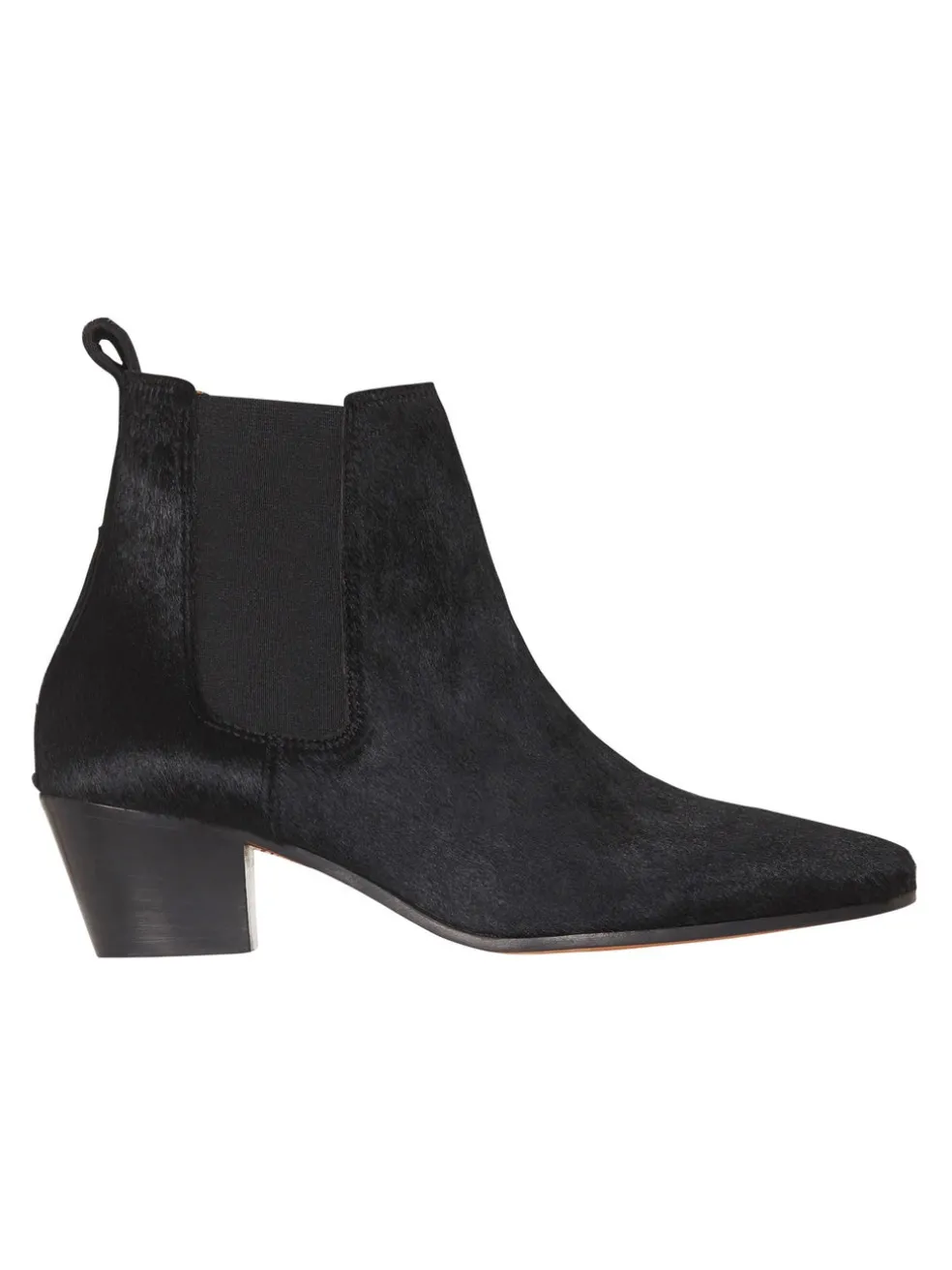 The IRO Yvany Boot is a stunning must have classic that will easily transition into any wardrobe. Constructed from black calf hair and leather, these Chelsea style boots feature an elasticated side gusset, stacked wooden heel and pointed toe.